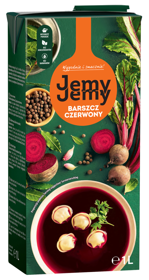 Barszcz czerwony JemyJemy to ten sam produkt, który do niedawna mogliśmy znaleźć na sklepowych półkach pod marką Profi. Ulepszona została jego receptura, aby w jeszcze większym stopniu trafiać w gusta konsumentów. Barszcz powstał w oparciu o tradycyjne przepisy polskiej kuchni - podstawą jego smaku jest wysoka zawartość intensywnego soku z buraków ćwikłowych (aż 57%), a jego dopełnieniem są starannie dobrane przyprawy i zioła. Barszcz czerwony JemyJemy jako jedyny na rynku nie wymaga doprawiania, a jego pełnym smakiem możemy cieszyć się zaraz po podgrzaniu, bez konieczności podkreślania jego koloru gotowanymi burakami.