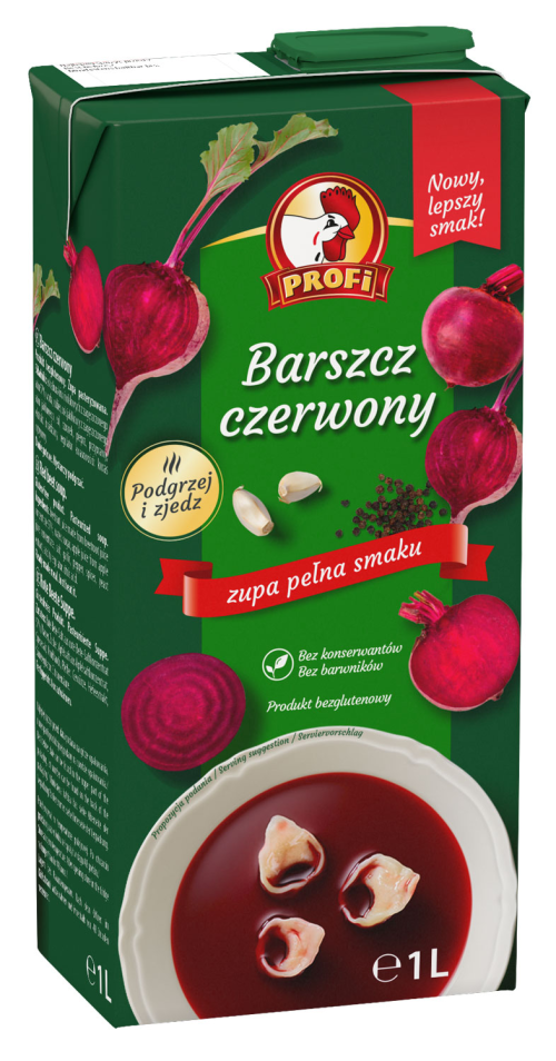 Barszcz czerwony Profi w kartonie 1 litrowym z zamknięciem na klips, podobnie jak jego odpowiednik w softpacku 450 g, są pasteryzowane, dzięki temu zyskują trwałość bez utraty walorów smakowych i intensywnej barwy. Jest również produktem pozbawionym glutenu, dlatego stanowi idealną propozycją dla osób przestrzegających diety bezglutenowej.