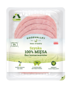 Goodvalley poszerza swój asortyment kategorii wędlin. W ofercie firmy pojawił się nowy produkt – szynka gotowana w plastrach o zawartości tłuszczu poniżej 3%. W opakowaniu znajduje się 100 gramów szynki z widocznymi w przekroju mięśniami. Nowość stanowi uzupełnienie dotychczasowej oferty wyrobów dołączając do parówek, boczku w plastrach oraz szynki w kawałku.