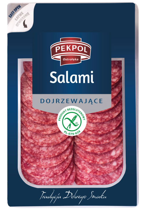 Aromatyczne salami w plastrach od ZM Pekpol to wędlina w sam raz na kanapkę, ale sprawdzi się także jako dodatek do różnego rodzaju przekąsek lub pizzy. Produkt jest oznaczony symbolem przekreślonego kłosa, który jest dla konsumentów istotną wskazówką, że jest w 100% bezglutenowy.