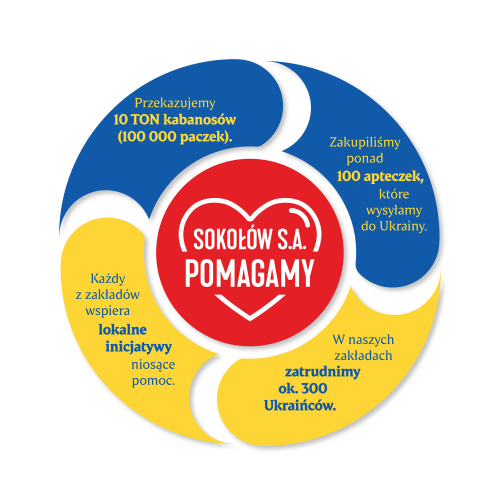 Odpowiadając na ogromne zapotrzebowanie na pomoc, jakie pojawiło się wskutek wydarzeń w Ukrainie, Sokołów reaktywuje na szeroką skalę akcję „Sokołów Pomagamy”. Obejmuje ona wielopoziomowe wsparcie zarówno żywnościowe, jak i rzeczowe. Dbając o to, by pomoc była jak najbardziej efektywna, Sokołów działa w porozumieniu z lokalnymi organizacjami pozarządowymi oraz samorządowymi. Za pośrednictwem Podkarpackiego Oddziału Okręgowego PCK, firma przekazała 10 ton wysokiej jakości kabanosów (100 000 paczek), które trafią na Ukrainę. Pomoc żywnościowa jest także realizowana lokalnie przez poszczególne zakłady. Sokołów zakupił ponadto dla mieszkańców Ukrainy apteczki pierwszej pomocy i gwarantuje obywatelom tego państwa ok. 300 miejsc pracy. Wartość pierwszej transzy wsparcia w ramach akcji „Sokołów Pomagamy” to ok. 1 000 000 złotych.