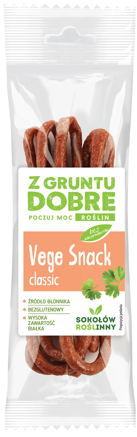 - Vege snack classic – to propozycja dla tych, którzy cenią kulinarne klasyki. Odpowiednia kompozycja przypraw zapewnia doskonałe walory smakowe. Dzięki poręcznej formie opakowania, te roślinne kabanosy znakomicie sprawdzą się w wielu okazjach.