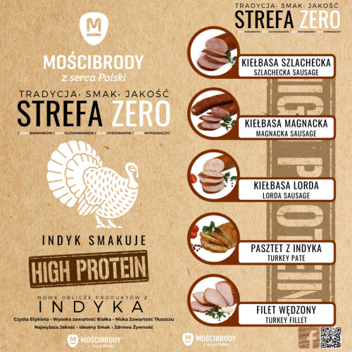 Zakład Mięsny Mościbrody to pierwszy na rynku przetwórca, który ma zamiar odkryć produkty z mięsa indyczego na nowo. Każdy kawałek użyty do produkcji pochodzi z polskiej wsi, od polskiego rolnika. Jest starannie wyselekcjonowany przez co produkty charakteryzuje najwyższa jakość. Każdy wyrób z listy cechuje inny, niepowtarzalny smak i wygląd co jest dowodem na to, że Strefa Zero jest dla wszystkich, nawet dla tych najbardziej wymagających klientów.