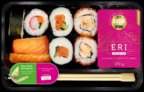 Mniejszy set, Sushi4You Eri (210 g), utrzymany został w kolorach różu i złota. W zestawie znajdziemy nie tylko 6 rolek sushi, ale także nowość na rynku – plastry sashimi z surowego łososia. Oczywiście w każdym z zestawów znajdują się wszystkie niezbędne dodatki, w tym pałeczki, sos sojowy, chrzan o smaku wasabi oraz imbir.