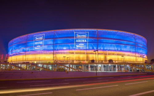 Solidarność z Ukrainą wyraża również sponsorowana przez firmę Tarczyński Arena Wrocław. Membrana stadionu została podświetlona w narodowych żółto-niebieskich barwach.