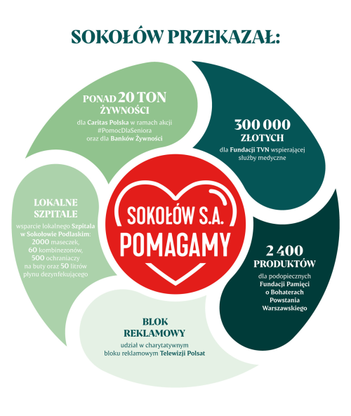 Pomoc od Sokołowa nadal napływa do potrzebujących. W ramach ogólnopolskiej akcji „Sokołów Pomaga”, firma przekazała ponad 20 ton produktów żywnościowych na rzecz osób w potrzebie oraz 300 000 zł na zakup środków ochronnych dla personelu medycznego. Tym razem ponad 9 ton produktów trafiło do Banków Żywności, a prawie 2 tony wędlin i przekąsek zostały przekazane do 8 szpitali zakaźnych. Sokołów nadal wspiera powstańców warszawskich, dzięki współpracy z Fundacją Pamięci o Bohaterach Powstania Warszawskiego oraz lekarzy i pielęgniarki na pierwszej linii walki z koronawirusem. Firma przekazała 2 000 maseczek oraz inne środki ochronne szpitalowi w Sokołowie Podlaskim.